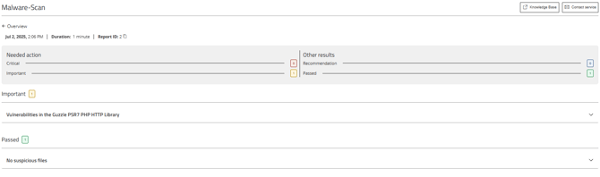 Der Malware-Scan identifiziert verschiedene Sicherheitsrisiken und stuft diese nach Dringlichkeit ein.